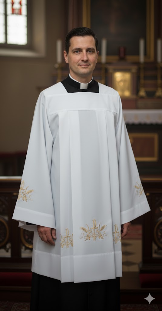 Chorhemd 8k mit Falten, Stickerei auf den Ärmeln, Vorder- und Rückseite.
