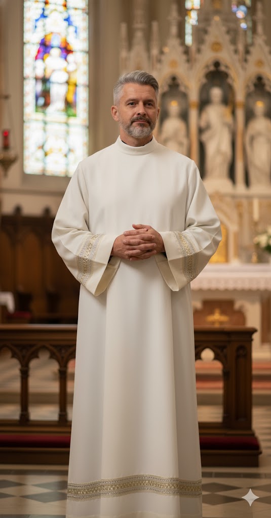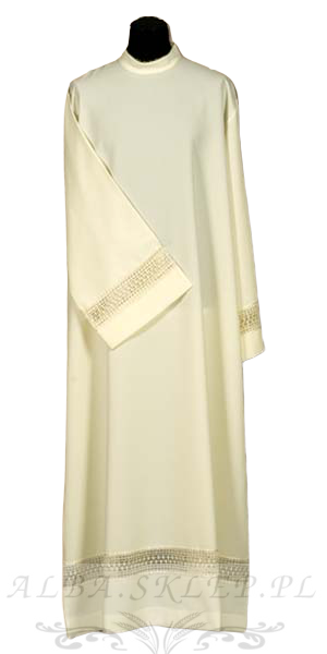 Die Albe wird aus Crepe-Stoff (100% Polyester) angefertigt.
