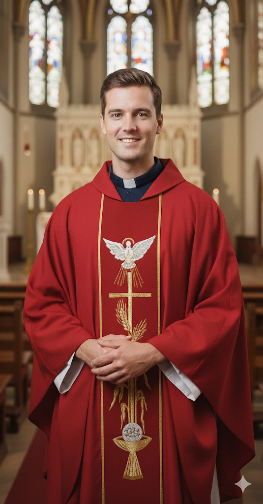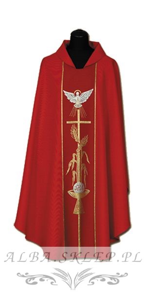 Schöne und leichte Kasel in rot mit einem roten Streifen mit Ornamenten.