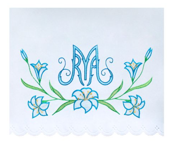We present an elegant altar cloth featuring beautiful blue embroidery of the Marian symbol and lilies, which symbolize purity and innocence. This cloth is perfect for Marian celebrations and for decorating the altar during services dedicated to the Virgin Mary.