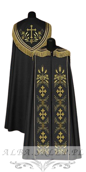 This black liturgical cope, with elegant golden embroideries, is the ideal choice for special liturgical ceremonies, bringing solemnity and elegance to every celebration.