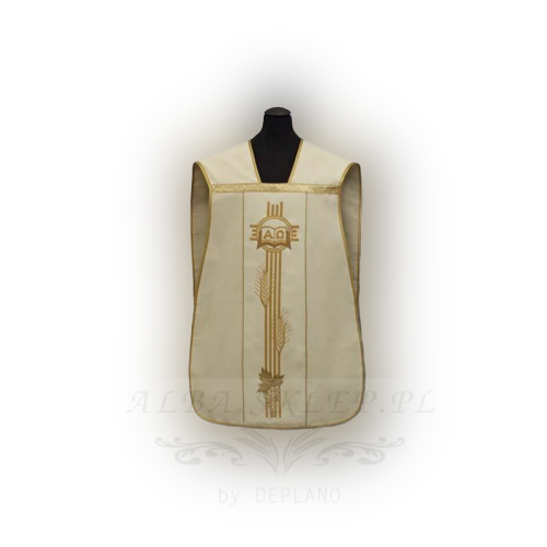 This elegant cream Roman chasuble, made from light and durable wool blend (elanowełna), is the perfect choice for liturgical celebrations such as baptisms, weddings, or feasts of the Lord. The gold embroidery depicting the Alpha and Omega symbols, wheat stalks, and grapevines symbolizes the Eucharist and the beginning and end of all things in Christ. 🌟
