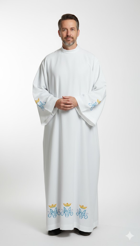 Marian Embroidery: A blue “M” monogram is embroidered on the sleeves and at the bottom of the alb, symbolizing a special connection with Mary. This subtle detail adds a unique character and spiritual depth. 🌷 Shoulder Zipper: A practical feature that makes putting on and taking off the alb easier. 🔄 Velcro Collar: Ensures comfort and a perfect fit, allowing you to focus on what matters most. 🙏 Material: Georgette – offers comfort, even during long ceremonies. 🌬️