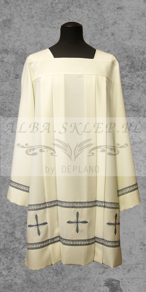 Elegant surplice made of stretch fabric in a Roman cut, giving it a classic and solemn appearance. Decorated with a gray-silver band finished with hemstitch, adding a unique touch. At the bottom of the surplice, there are embroidered crosses, emphasizing its religious character.