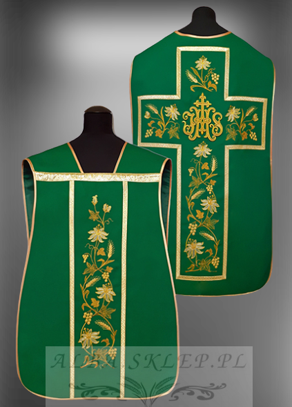 This beautiful green Roman chasuble, made from high-quality wool blend, is the perfect choice for Ordinary Time in the liturgical calendar. It is richly adorned with gold embroidery, giving it a unique and sacred character, ideal for solemn liturgical celebrations. 🌟