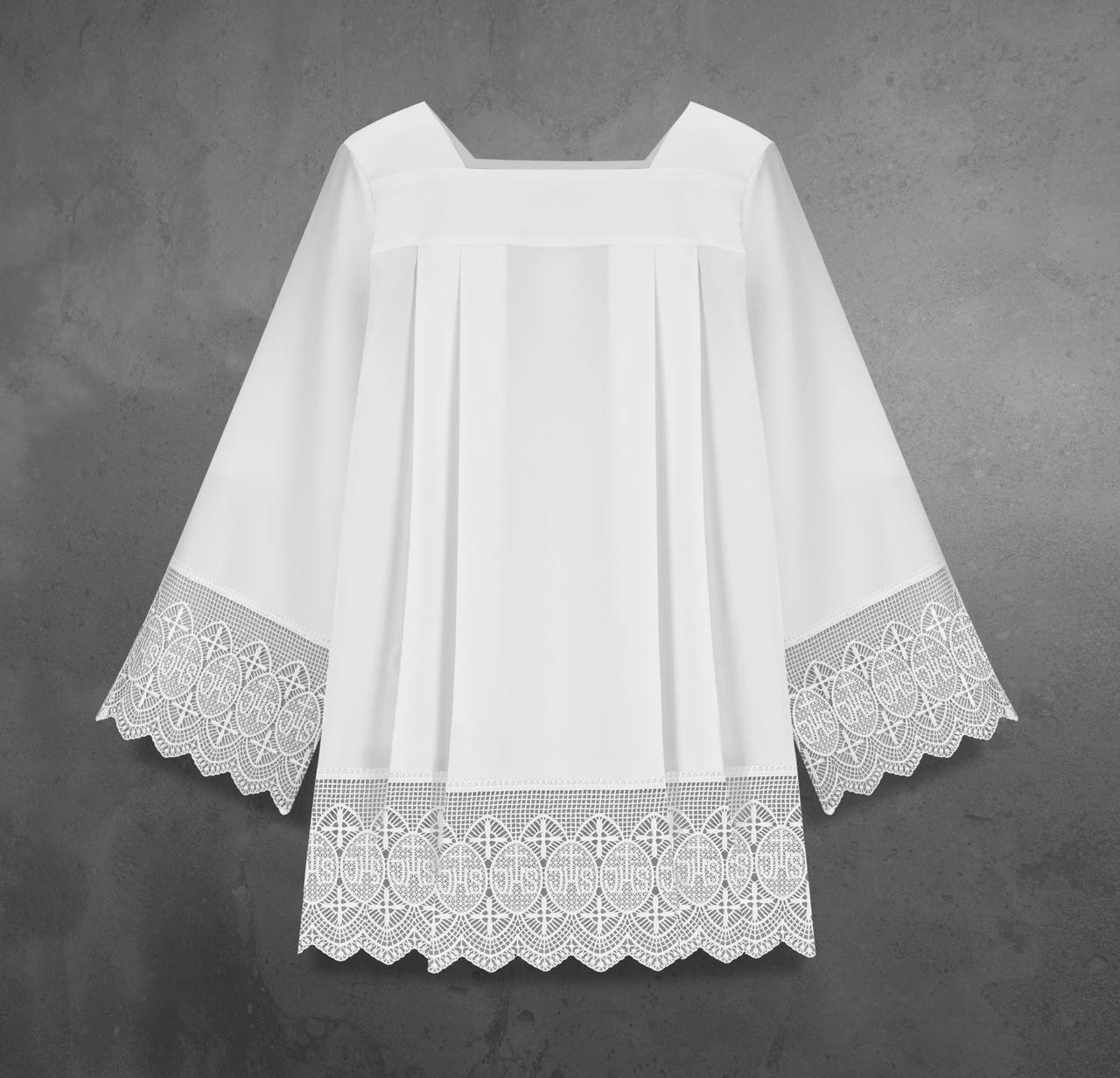 📜 Presenting an exceptional priestly surplice adorned with beautiful IHS lace, 27 cm wide! 🎉 Perfect for both liturgical celebrations and daily priestly duties. The surplice features elegant pleats on the front and back, giving it a classic and dignified appearance. ✝️