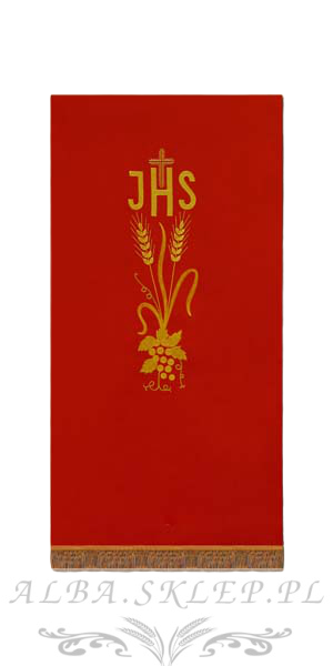 We present an elegant red lectern cover adorned with a JHS embroidery along with motifs of wheat and grapes. This symbolic design reflects the spiritual presence of Jesus Christ and His sacrifice, creating an atmosphere of dignity and deep reflection.