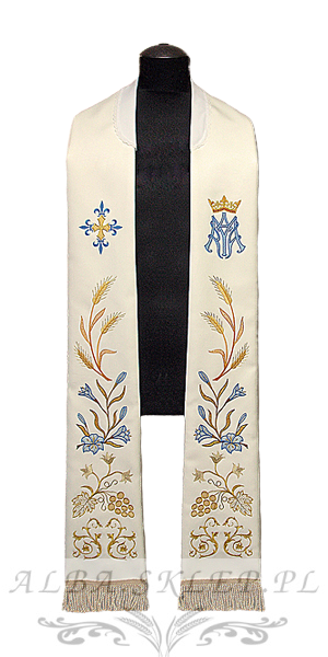 We present an elegant Marian stole, richly embroidered with beautiful motifs, which will be an excellent addition to any liturgy. Made from high-quality fabric, the stole combines aesthetics and symbolism, while its carefully crafted embroidery features beautiful flowers, grapes, and the symbolism of Mary, Queen of Heaven. 🌸🍇