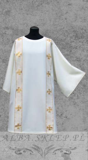 📜 Presenting an elegant white deacon dalmatic, perfect for liturgical celebrations. 🎉 The dalmatic is adorned with beautiful crosses, giving it a distinctive sacred character. A matching stole is also included in the set.