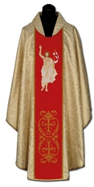 Elegante casula pasquale dorata, realizzata in tessuto di alta qualità con una delicata finitura brillante, perfetta per le celebrazioni della Risurrezione. Sulla parte anteriore è raffigurato Cristo Risorto con il vessillo della vittoria, simbolo del trionfo della vita sulla morte e della gioia della Risurrezione. La fascia rossa decorativa è arricchita da ornamenti raffinati, che aggiungono un tocco di eleganza e profondità simbolica al design.