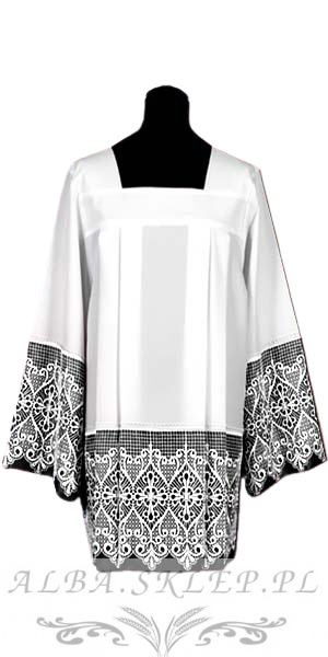 🌟 Descrizione del prodotto: Elegante cotta sacerdotale con pizzo guipure nero-bianco sulle maniche e sul bordo inferiore, arricchita da una raffinata fodera nera. Questo prezioso abito liturgico si distingue per il pizzo decorativo che dona solennità e un aspetto maestoso. La fodera nera del pizzo crea un bel contrasto, esaltando l’eleganza classica della cotta – perfetta per importanti cerimonie liturgiche.