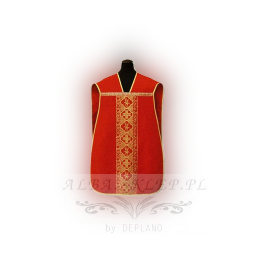 Questa elegante pianeta rossa, realizzata in lussuoso tessuto damascato, è la scelta perfetta per le celebrazioni liturgiche, in particolare quelle legate al martirio e alle feste dello Spirito Santo. Il tessuto damascato di alta qualità dona alla veste un’elegante lucentezza e un aspetto ricco, mentre le decorazioni dorate ne sottolineano il carattere solenne. 🌟