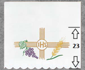 Presentiamo una elegante tovaglia per altare che unisce bellezza e profonda simbologia. La ricca ricamatura dorata, che presenta la croce e il simbolo IHS al centro, sottolinea la dimensione spirituale dell’Eucarestia. Le decorative uve e spighe di grano attorno al motivo donano un carattere straordinario, perfetto per le celebrazioni liturgiche.