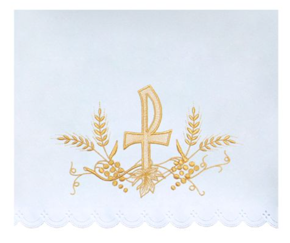 Prezentujemy elegancki obrus ołtarzowy z pięknym złotym haftem przedstawiającym krzyż PX otoczony symbolicznymi motywami kłosów pszenicy i winogron. Ten wyjątkowy wzór podkreśla głębokie znaczenie Eucharystii, czyniąc go idealnym wyborem na uroczystości liturgiczne i msze święte.
