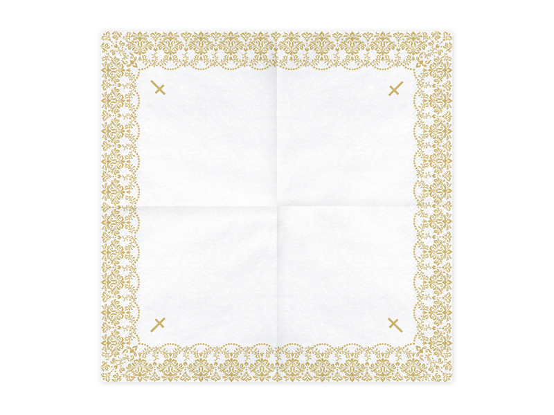 Serwetki papierowe białe ze złotym ornamentem, wymiary po rozłożeniu ok. 33 x 33 cm, wymiary po złożeniu ok. 16,5 x 16,5 cm.