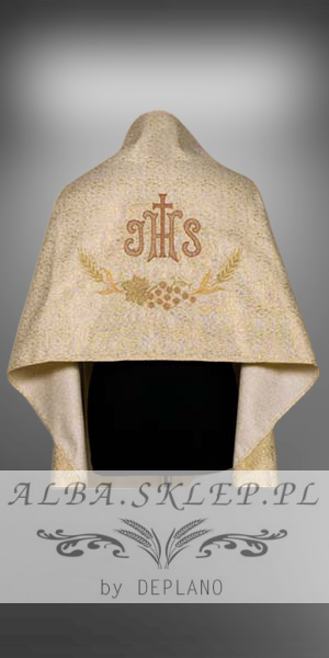 🌟 Welon ozdobiony jest haftowanym symbolem IHS – tradycyjnym oznaczeniem imienia Jezusa Chrystusa – otoczonym motywem winogron i kłosów pszenicy, które symbolizują Eucharystię. Ten duchowy wzór dodaje głębokiego znaczenia każdej ceremonii liturgicznej. ✝️🍇🌾